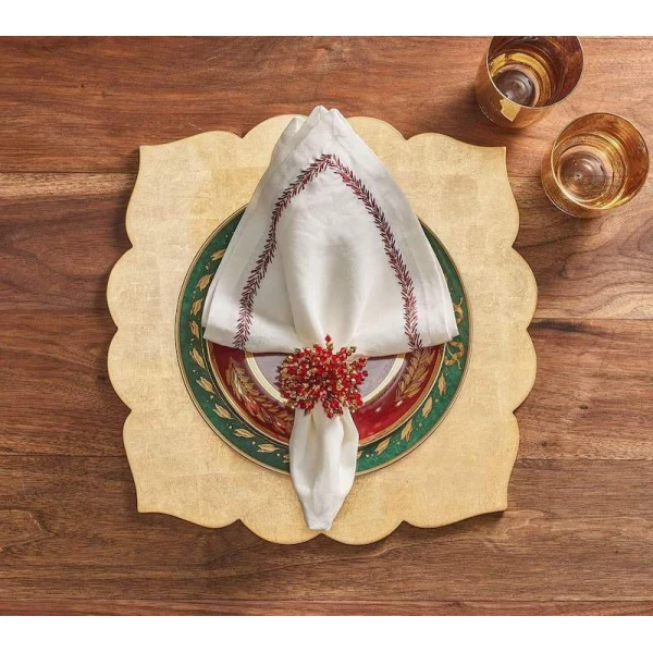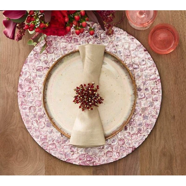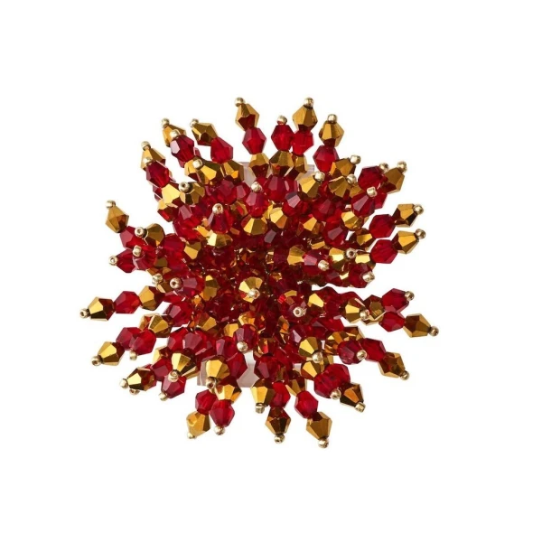 Kim Seybert's Brilliant Red Napkin Rings can be used for the holidays or your every day table.  It features fire polished glass, acrylic and metal beads. The glistening red napkin ring is hand-crafted, each bead is strung to form a glamorous burst of energy. The perfect napkin ring to accentuate a lavish table or to add sparkle to a more subtle setting.  70% glass, 25% acrylic, 5% metal.