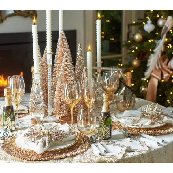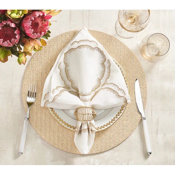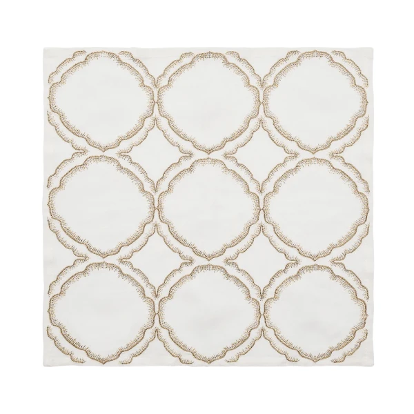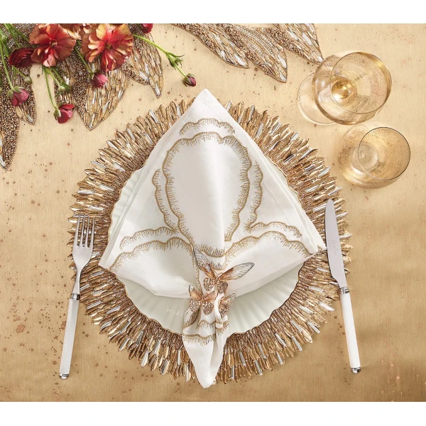 Kim Seybert's Daydream Napkin in White, Gold & Silver have a regal quality, with its hand-embroidered, cloud-like pattern repeated in gold and silver. Elaborate details embellish this elegant linen napkin. Complete the look with the coordinating Daydream Tablecloth. Use these napkins for special occasions such as anniversaries, milestone birthdays and weddings. 100% Linen.