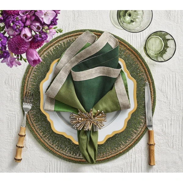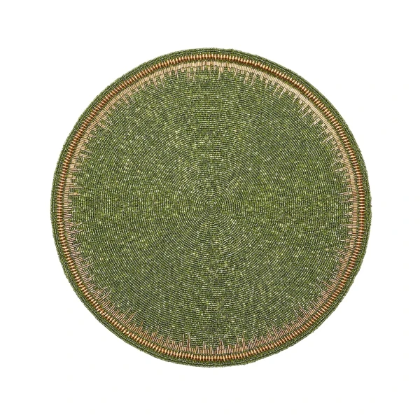 Kim Seybert's Enamor Placemat in Green & Gold is characterized by an intricate pattern that mimics the beauty of uneven brushstrokes. The glass and acrylic beads were expertly hand-arranged to create an irregular border. Seen here in green and gold, it evokes the spirit of spring. It is available in a variety of colors to suit different entertaining styles. 15” Length x 15” Width x 0.25” Height. 80% Glass Beads, 20% Plastic Beads on Cotton Backing. Set of four.