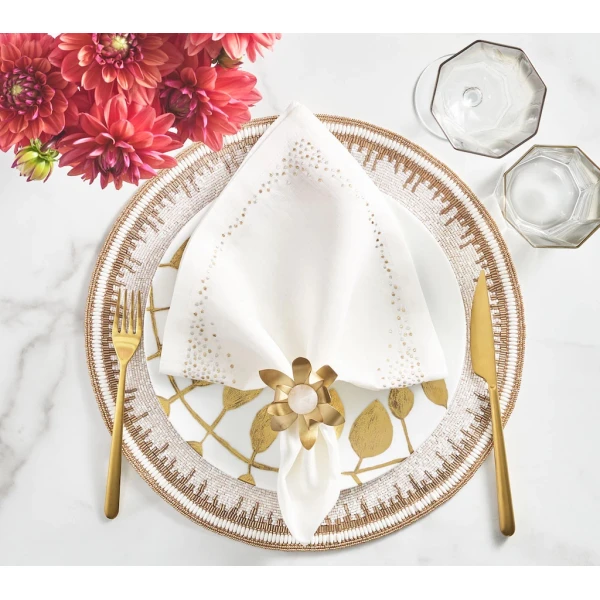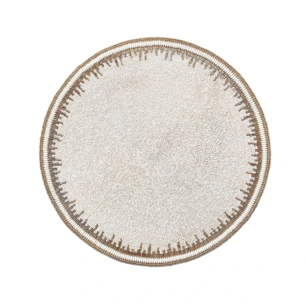 Kim Seybert's Enamor Placemat in White & Gold is characterized by an intricate pattern that mimics the beauty of uneven brushstrokes. The glass and acrylic beads were expertly hand-arranged to create an irregular border. Seen here in green and gold, it evokes the spirit of spring. It is available in a variety of colors to suit different entertaining styles. 15” Length x 15” Width x 0.25” Height. 80% Glass Beads, 20% Plastic Beads on Cotton Backing. Set of four.