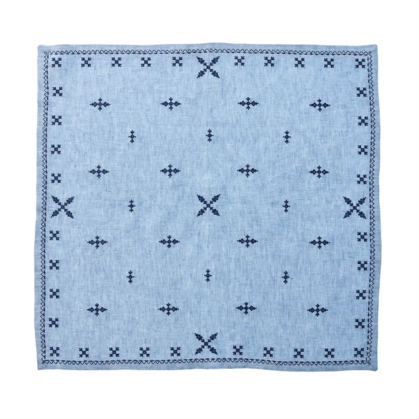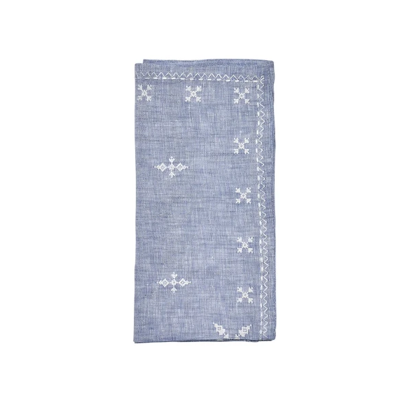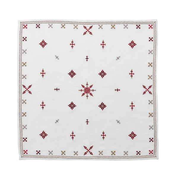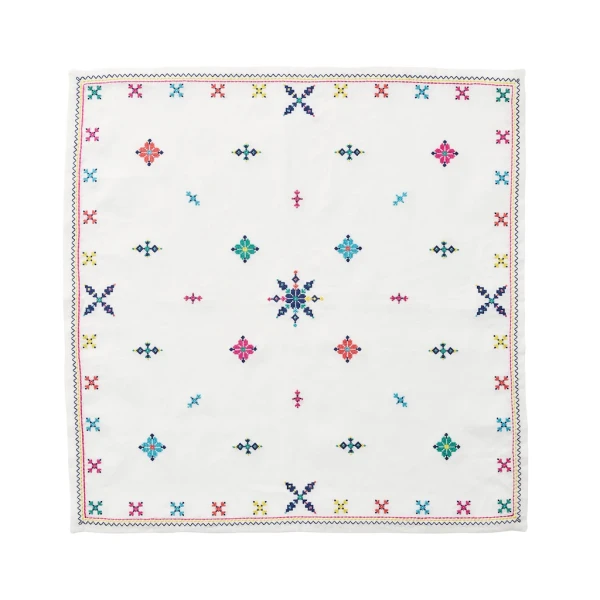 Kim Seybert's Fez Napkin features traditional Moroccan embroidery. The white napkin features colorful embroidered details arranged in a symmetrical pattern across the napkin. A multicolored-striped border completes the festive design.  100% Linen.
