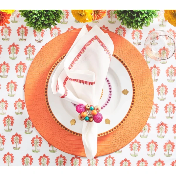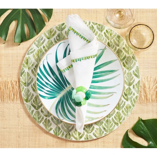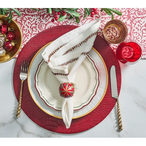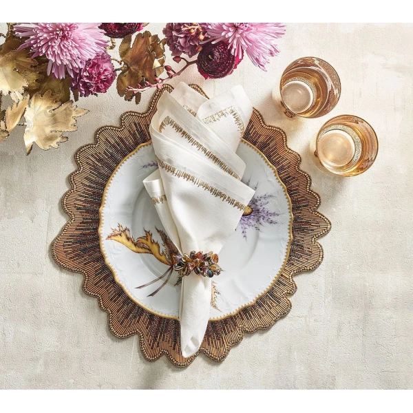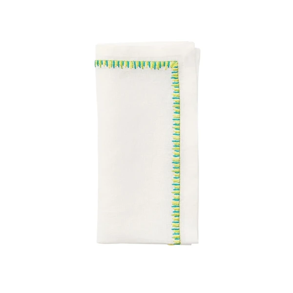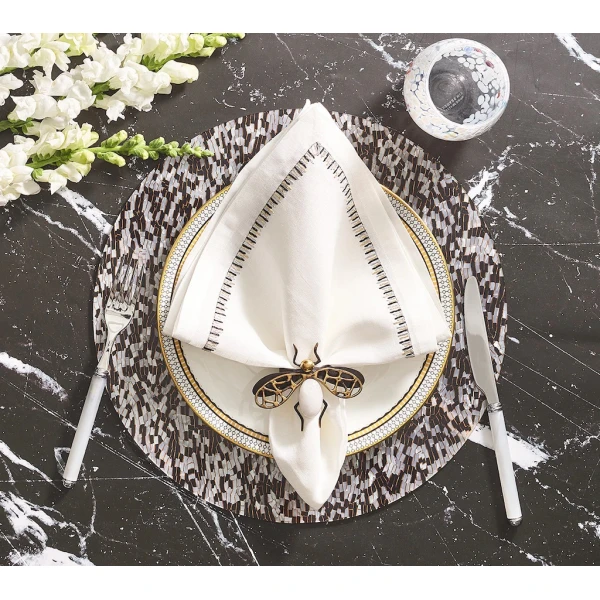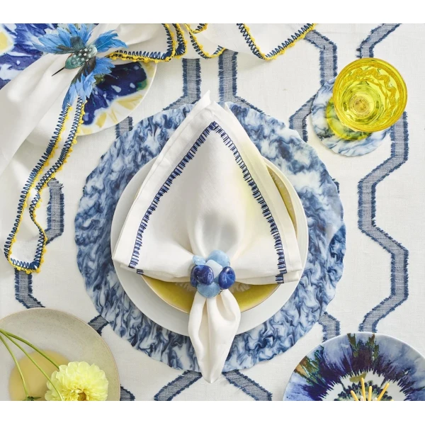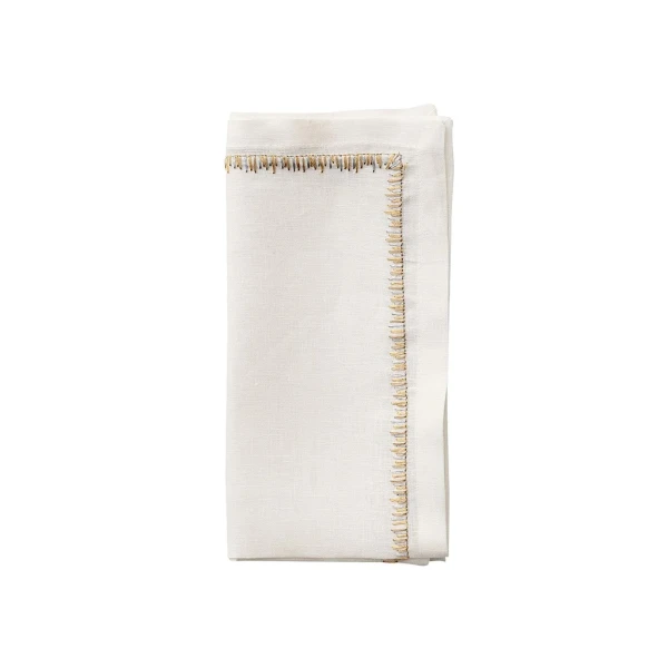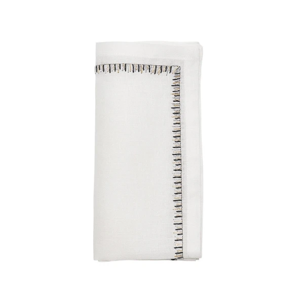 Kim Seybert's Filament Napkin is defined by long, embroidered stitching along the edge. The stitches contrast against the white linen napkin similarly to the way the bright light contrasts against the frosted glass. 100% linen