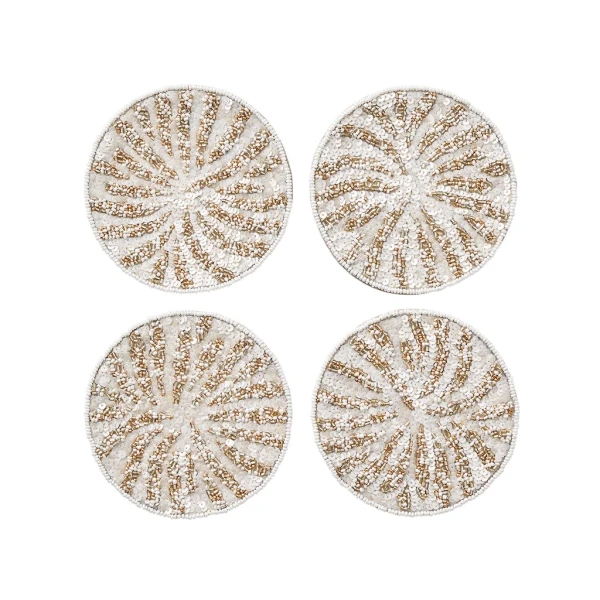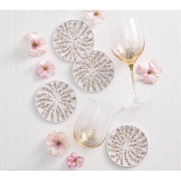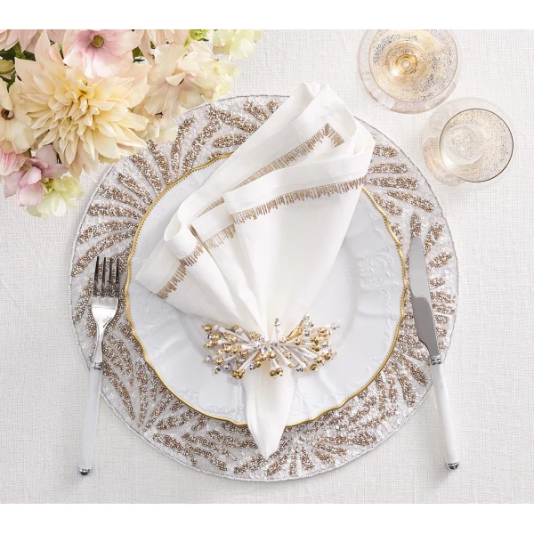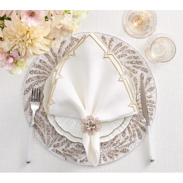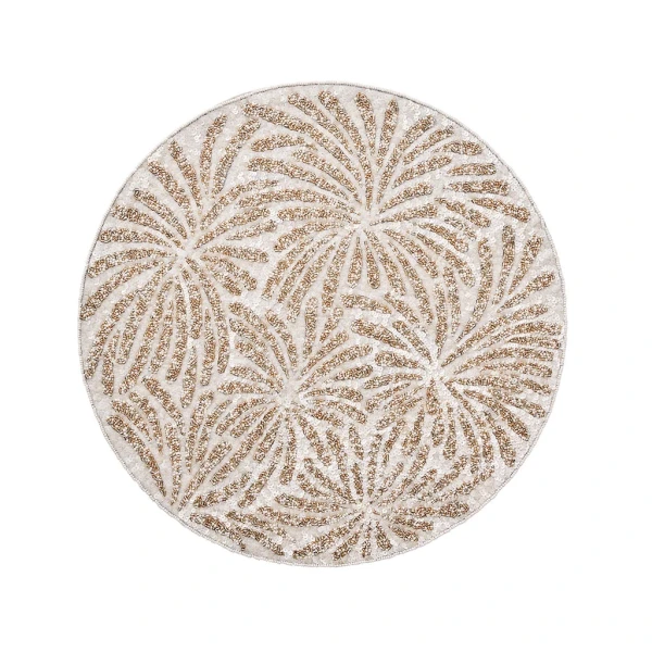 Kim Seybert's Fireworks Placemats take their cue from the celebratory sparkling bursts in the summer sky. Glass and acrylic beads in silver and gold are hand sewn on this transitional-style placemat and a crunch-beading technique is used to create the metallic fireworks.  65% Glass Beads, 35% Plastic Beads on 100% Cotton Backing. 15" Length x 15" Width x 0.25" Height.