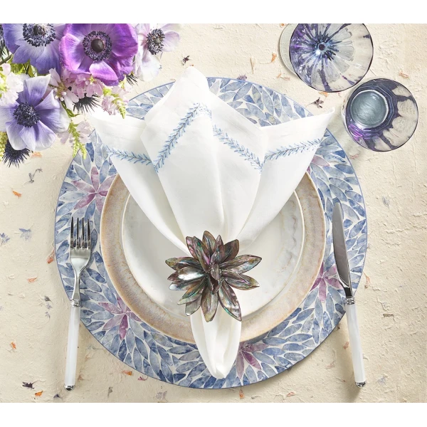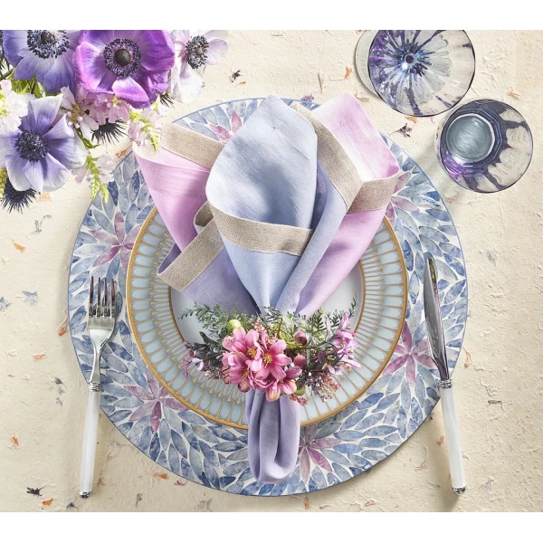 Kim Seybert's Flora Placemats in Lilac & Periwinkle are made of delicate and lustrous Capiz shells, which are cut in a marque shape and placed carefully to create an ombre effect. The lilac and periwinkle placemat mimics nature’s most beautiful springtime flowers.  100% Capiz Shells.
