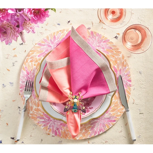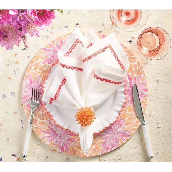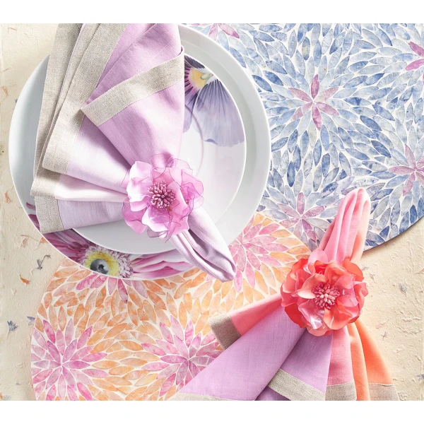 Kim Seybert's Flora Placemats in Sorbet feature layers of Capiz shells fashioned into elegant flower petals. Similar in appearance to Mother of Pearl, Capiz shells are coveted for their delicate appearance and natural luster. On the round placemat, the hand-dyed shells are cut in a marque shape and arranged to create an ombre pattern—a subtle and sophisticated take on springtime florals. 100% Capiz Shells.