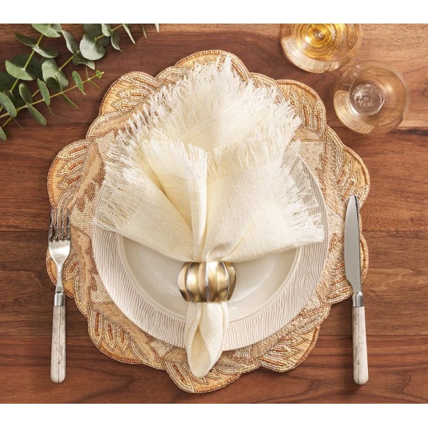 Kim Sybert's Fringe Tablecloth is a glamorous take on farmhouse chic. Gold lurex is woven with white linen -- creating an elevated shimmer. Available in one size -- 50 x 110. Also come in natural colored linen with silver lurex. 99% linen/1% lurex. Matching napkins available.