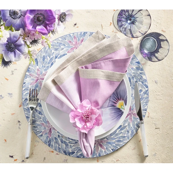 Kim Seybert's Gardenia Napkin Ring in Lilac depicts the beautiful purple blossom in full bloom. Molded by hand, lilac-colored sequins form individual petals on a metal napkin ring base. The delicate petals are then hand-layered to create a realistic bloom. The lifelike flower sits atop the beaded base of the napkin ring. 70% Plastic Beads, 15% Glass Beads, 15% Metal Base. 4" Length x 4" Width x 3.25" Height.