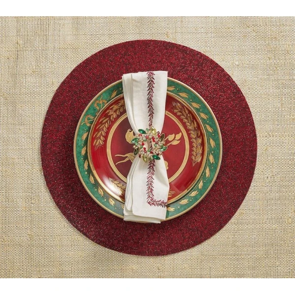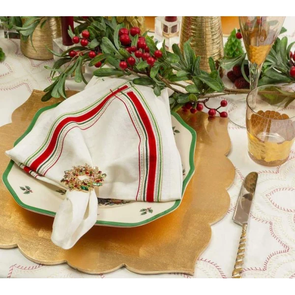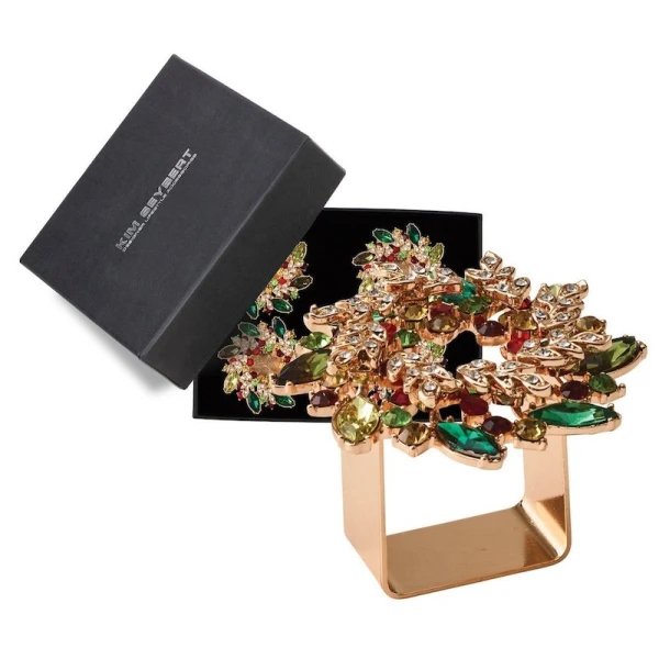 Kim Seybert's Gem Wreath Napkin Rings are dazzling for Christmas time entertaining! Why limit holiday wreaths to doors and windows? At Kim Seybert, they have found a way to introduce them to your holiday table setting. In multiples too! Welcome the Gem Wreath napkin ring; an embellished and bedazzled miniature wreath atop a gold square ring. 55% rhinestones, 45% metal