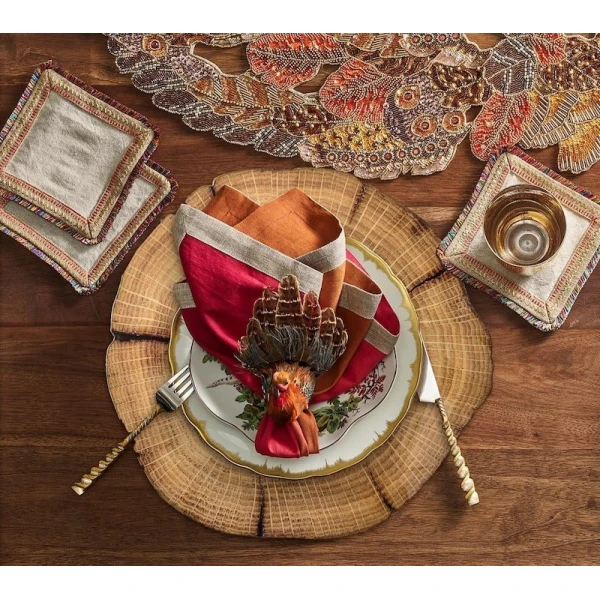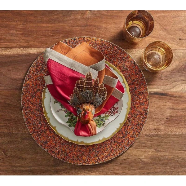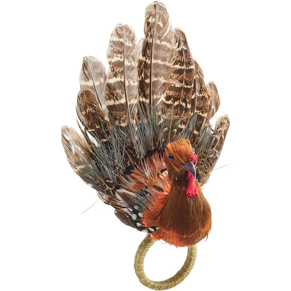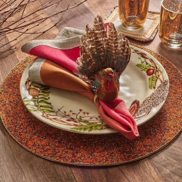 Kim Seybert's Gobble napkin rings are perfect for setting a stunning Thanksgiving table. Gobble has natural feathers and are part of the autumnal Harvest Collection. They are sure to add a festive touch to your autumn table settings. This Thanksgiving Napkin Ring features fall shades of brown, reds and oranges. 40% Pheasant Feathers, 20% Goose Feathers, 20% Styrofoam, 10% Duck Feathers, 10% Wood.