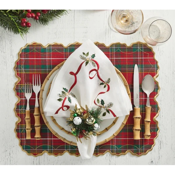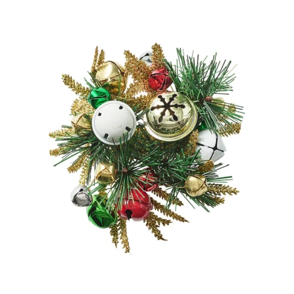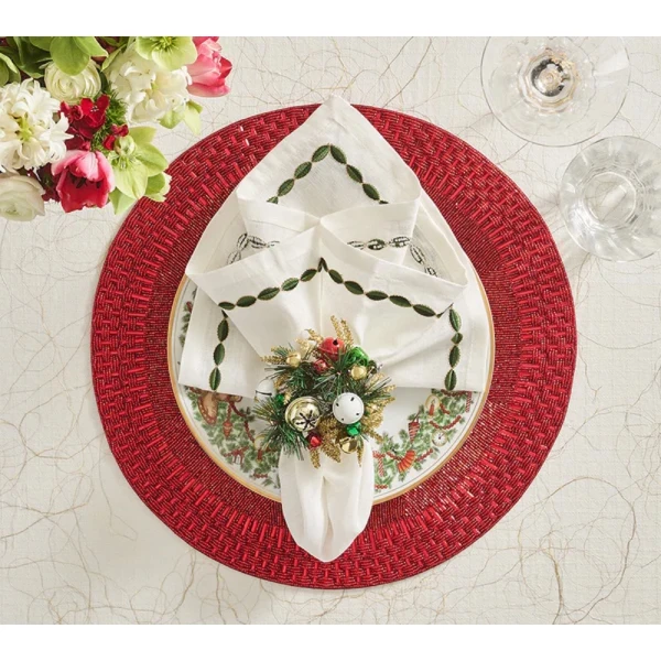 Jingle Bells Napkin Ring in Green, Red & Gold are adorned with multicolor bells that softly chime with your guest's arrival at the holiday table. Embellished with a classic evergreen wreath, this decorative detail adds whimsy and a splash of festive color to your celebrations. 45% Plastic, 30% Metal, 20% Glass beads, 5% Paper.
