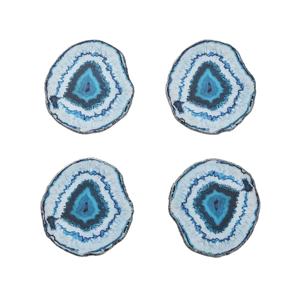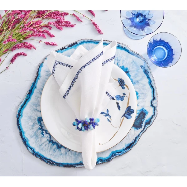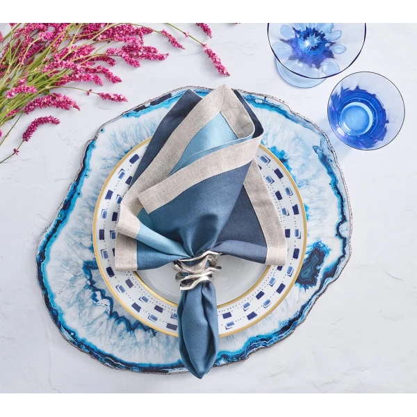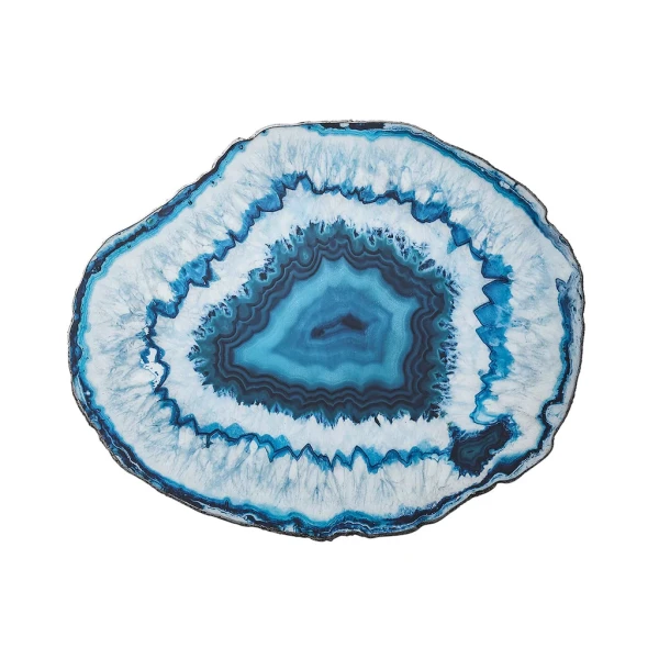 Kim Seybert's Marine Placemats were inspired by the natural beauty of blue lace agate, a pale blue crystal. The placemat design mimics a slice of exquisite agate and features a fresh color way of blues and whites. Its sleek resin finish sets it apart from other placemats. Plus, it is made from an acrylic material that is easy to clean. 70% MDF, 20% Acrylic, 10% Cork. 16.5" Length x 14" Width x 0.25" Height.