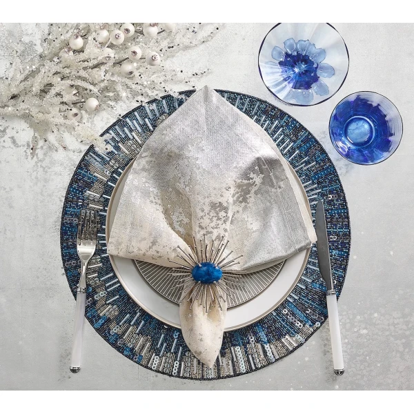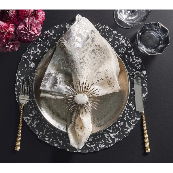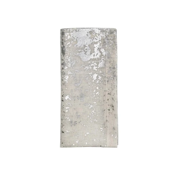 Kim Seybert's Metafoil Napkin in White & Silver uses an innovative hand-done technique, the metallic silver foil is printed on a linen napkin creating an organic, splatter effect. Offered in silver and gold colorways, the glistening foil on the linen napkins is reminiscent of the refraction of light on glass skyscrapers.