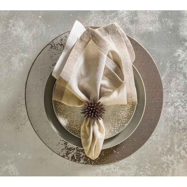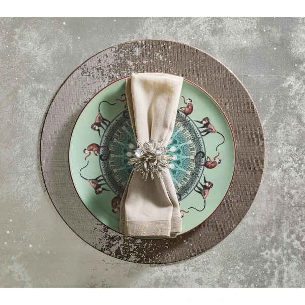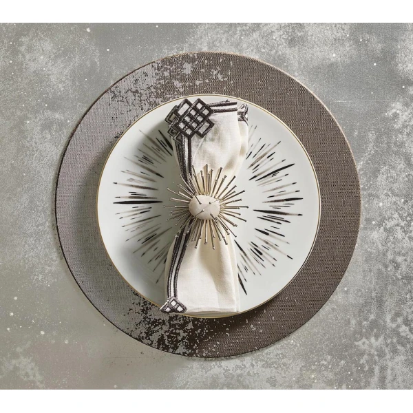 Kim Seybert's Metafoil in Taupe & Silver Placemat is evocative of sunlight striking glass. Using an innovative hand-done technique, metallic foil is printed on a round placemat creating an organic, splatter effect. Offered in silver and gold color ways, the gold and silver placemats glistening foil is reminiscent of the refraction of light on New York City glass skyscrapers.