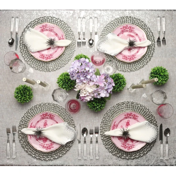 Kim Sybert's Metafoil Tablecloth in White & Silver uses an innovative hand-done technique -- the metallic silver foil is printed on a linen tablecloth creating an organic, splatter effect. Offered in silver and gold colorways, the glistening foil on the linen is reminiscent of the refraction of light on glass skyscrapers. Matching napkins available.