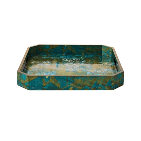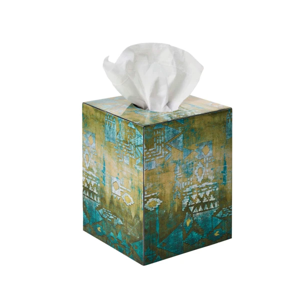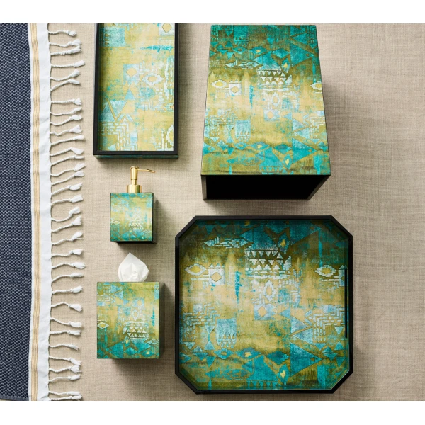 Mirage, from Kim Seybert, is inspired by a vintage textile, the verdant colors of moss and turquoise adds a sophisticated global touch to all rooms.