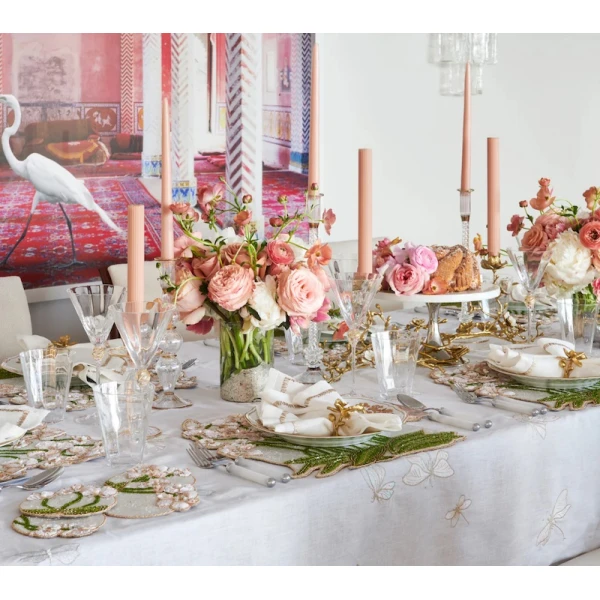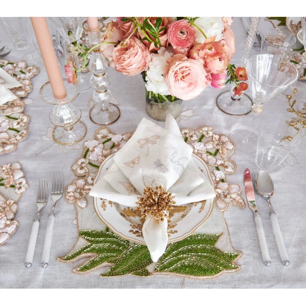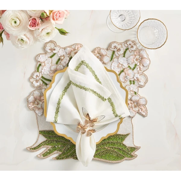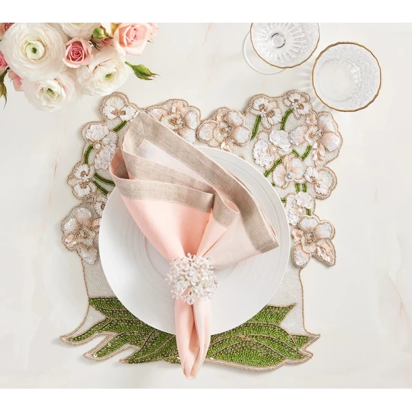 Kim Seybert's Orchid Placemat is a display of 25 unique gemstones presents a vivid orchid show with three-dimensional details that spark guests' imaginations. Add a dazzling napkin ring for the grand finale to this remarkable setting. The Orchid Placemat creates a sense of occasion for every celebration. Set of Two.