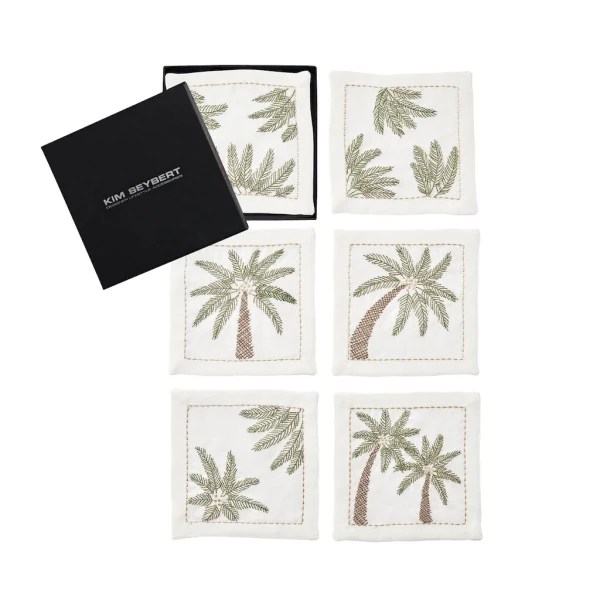 Kim Seybert's Palm Coast Cocktail Napkins are inspired by palm trees, the aptly named Palm Coast Cocktail Napkins showcase six different hand-drawn designs of palm trees embroidered on a white linen napkin. The green palm fronds seem to bend and sway off the napkin while the golden embroidered trunk anchors the motif.  Gift boxed in a set of 6. 100% Linen.