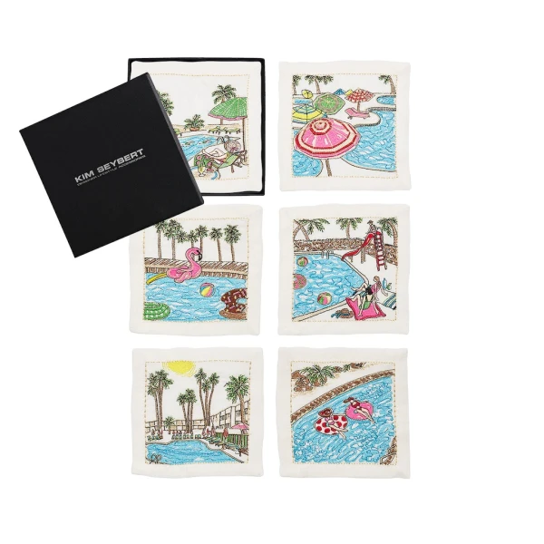 Kim Seybert's Pool Day Cocktail Napkins in White & Multi capture a never-ending summer vibe with these poolside cocktail napkins, which will bring sunshine to your gatherings. The Pool Day linen cocktail napkin features a hand-drawn lively and vibrant pool scene. These embroidered cocktail napkins exude style while embracing the relaxed charm of poolside entertaining. They are perfect for relaxing summer days. offer a contemporary update to the standard white cocktail napkin, featuring a thick embroidered geometric edge accented by delicate pick-stitching. This harmonious border beautifully frames the entire linen napkin. Gold embroidery adds a glow to the crisp white linen, creating a luminosity that enhances the square napkin's charm. With its versatile design, this cocktail napkin effortlessly elevates any party setting. Gift boxed in a set of 6. 100% Linen.