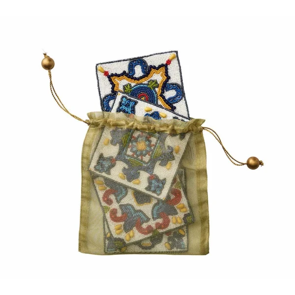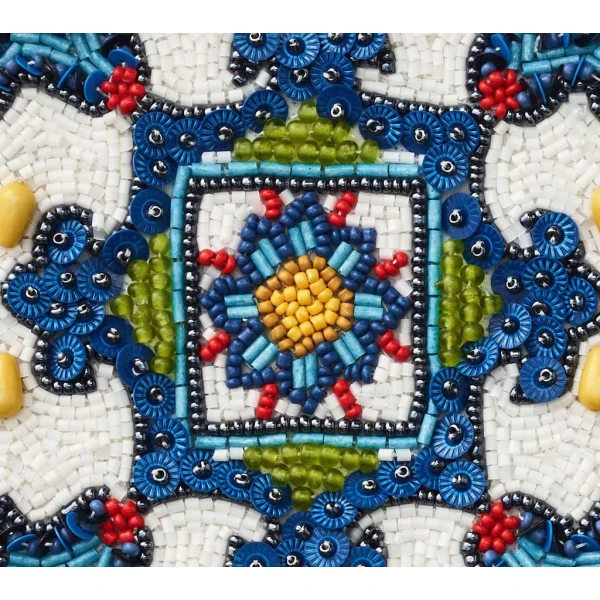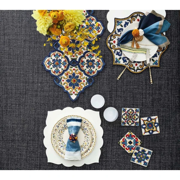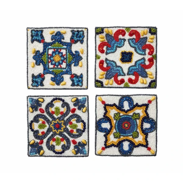 Kim Seybert's Serengeti Coastersare inspired by Moorish architecture and colorful flamenco dancing costumes of Seville informed the designs of this hand beaded coaster set. Use them with the matching placemats for a fun fiesta themed party. 4.5" x 4.5" x 0.2".  60% glass beads, 35% plastic beads, 5% chip beads,100% cotton backing