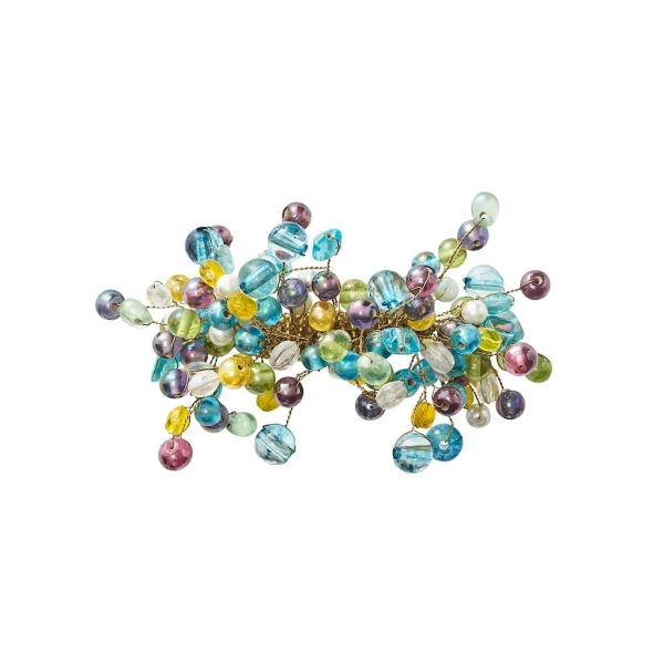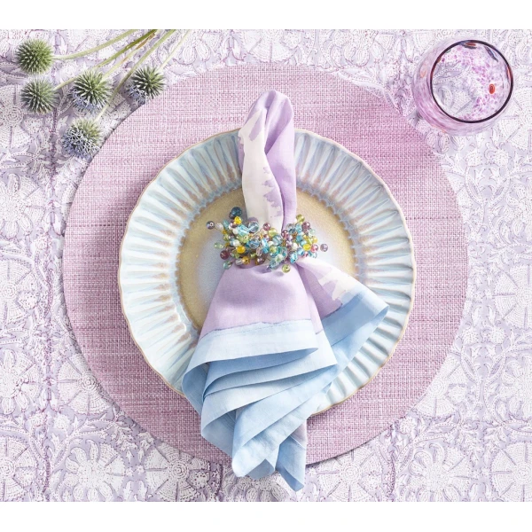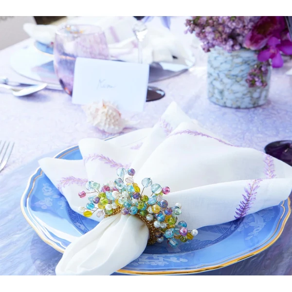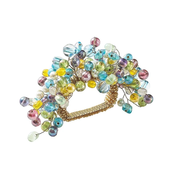 Kim Seybert's Spritz Napkin Rings in Sorbet are handmade. Each glass and plastic bead is hand-placed to resemble the spray of the ocean. The base is a metallic gold color and acts as a jumping-off point for the pastel beads that are arranged in a scattered pattern to create a stunning visual effect. 45% Glass Beads, 30% Metal, 25% Plastic Beads.