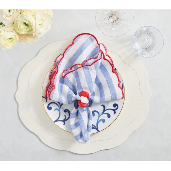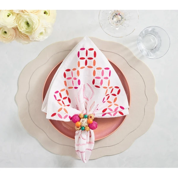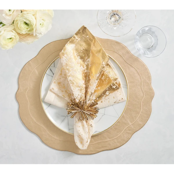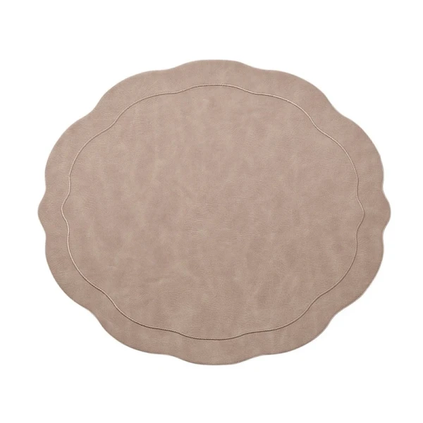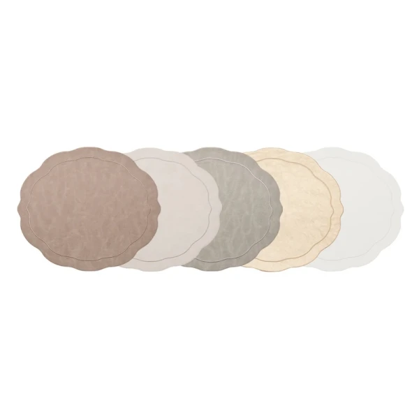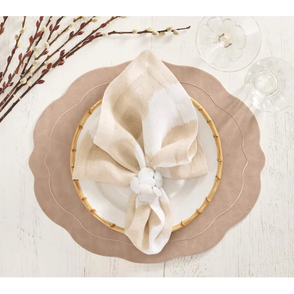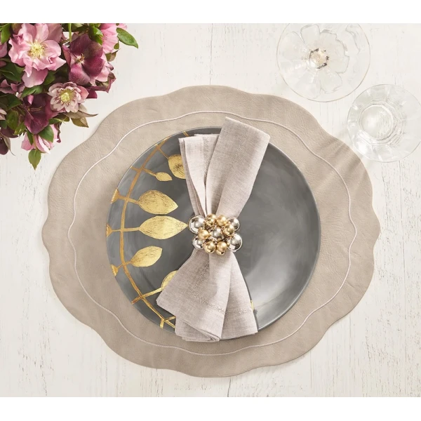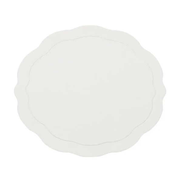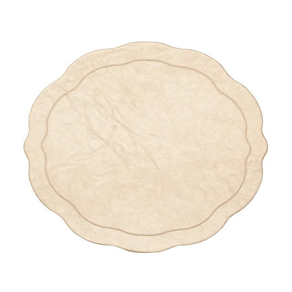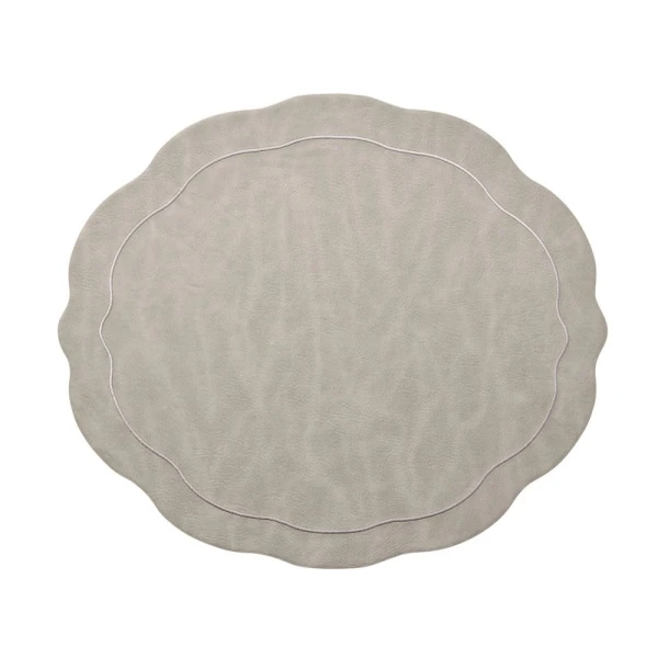 Kim Seybert's Tailored Placemats in Neutral Tones have a traditional oval shape with a modern refresh. A stylish wavy edge and embroidered tone-on-tone border detailing elevate this faux leather accessory. This hard-backed versatile placemat is available in a variety of colors. 100% Polyurethane with PVC Backing. 17.25" Length x 15" Width x 0.1" Height. Sets of Two.
