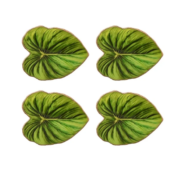 Kim Seybert's Tropicana Coasters in Green are a heart shaped tropical leaf design, which is printed on acrylic and backed with cork for protection. The vibrant green hue and radiating veins on the frond give these coasters a distinct look. Because of the acrylic coating, the coasters are easy to clean with just a quick swipe of a wet cloth. The drink coasters are sold in a gift box as a set of four, making them an ideal hostess gift. 70% MDF, 20% Acrylic, 10% Cork.