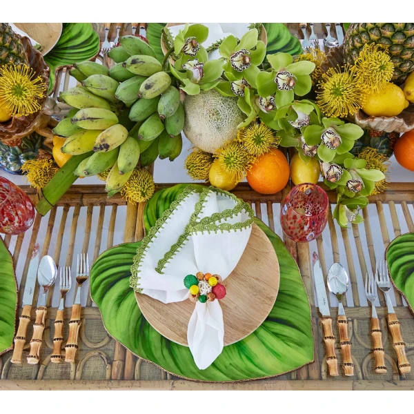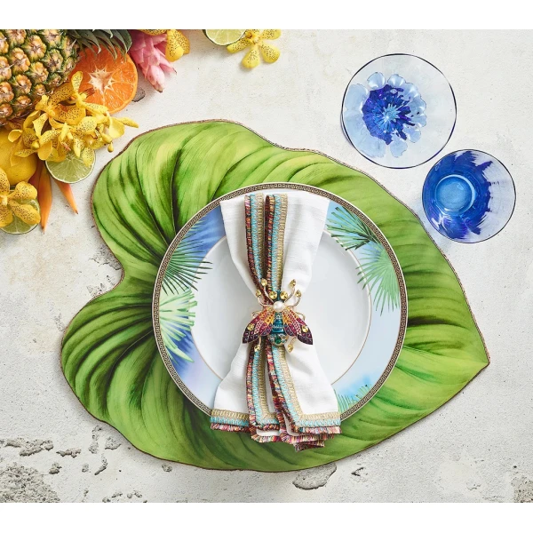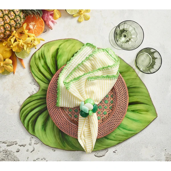 Kim Seybert's Tropicana Placemat in Green is modeled after a heart-shaped tropical leaf. The design is printed on acrylic and backed with cork for protection. The vibrant green hue and radiating veins on the frond give the placemat exciting visual interest. Because of its acrylic coating, the placemat is easy to clean with just a quick swipe of a wet cloth. 18" Length x 14.25" Width x 0.25" Height. 70% MDF, 20% Acrylic, 10% Cork.