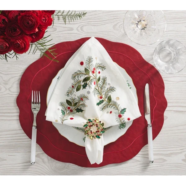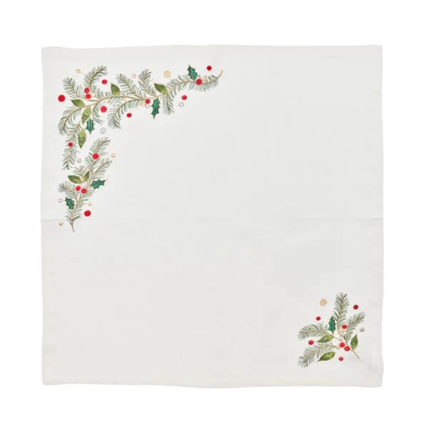 Kim Seybert's Xmas Carol Napkin in White, Red & Green will set a festive tone with hand-drawn boughs of holly and bright berries delicately embroidered on crisp white linen. 100% Linen.