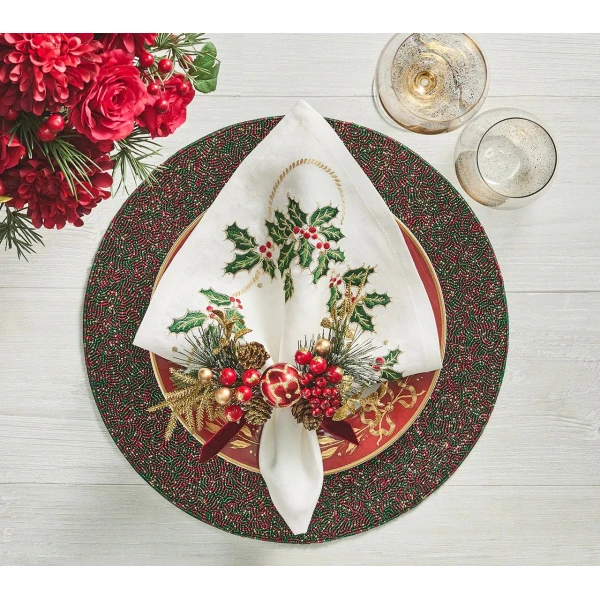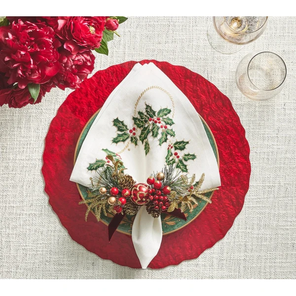 Kim Seybert's Xmas Cheer Napkin Rings will add a touch of joy and sparkle to your Holiday Table. Fashioned from pinecones, faux berries, and frosted branches, this Christmas mix is reminiscent of a wintery Christmas morning. Each napkin ring finished with a traditional velvet ribbon for added detailing. Last year's Xmas Tidings napkin ring sold out quickly -- we expect this to be gone soon.
