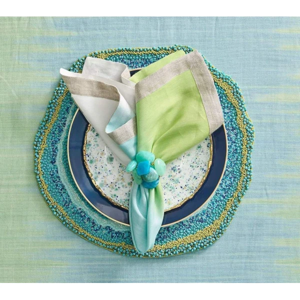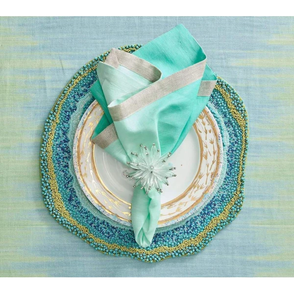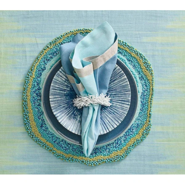 Kim Seybert's Zanzibar Placemats feature a birds-eye view of the Zanzibar Archipelago, the hand-beaded, round Zanzibar Placemat uses 20-30 different beads to recreate a beaded topographic image of the islands. Inspired by turquoise-blue water and shallow sandbars surrounding the coasts of Tanzania, the round, beaded Zanzibar Placemat is the perfect addition to a summer celebration. 80% glass beads, 20% plastic beads. 15.5" x 15.75" x 0.25".