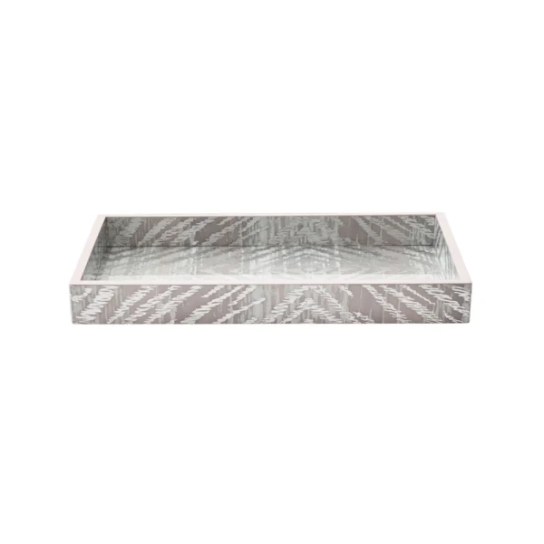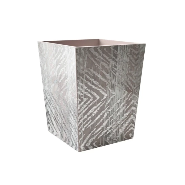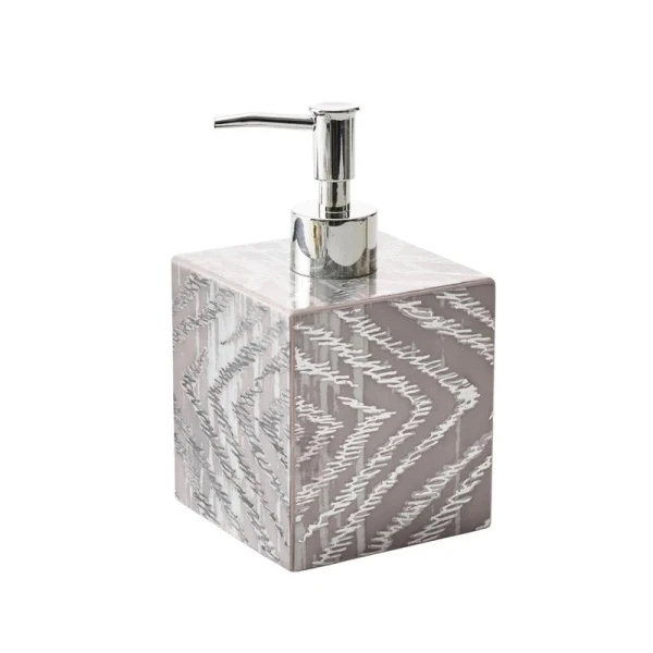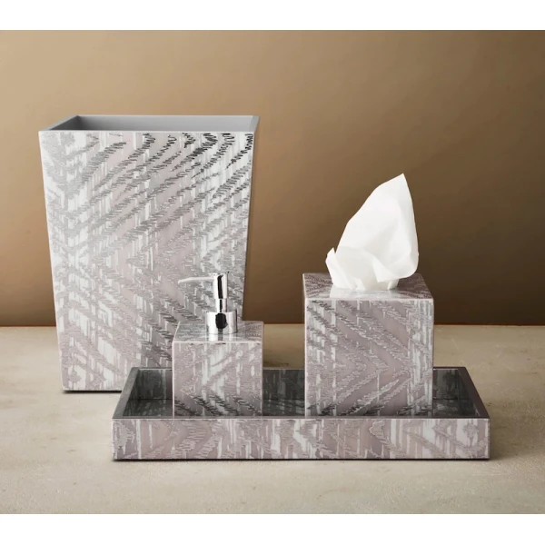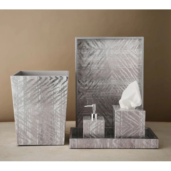 Kim Seybert's Zebra has been re-interpreted. Instead of the traditional black and white color combination, they washed it in metallic silver and gray. They are made by hand using lacquer techniques and metallic foiling. The result is a modern must-have bath set. 100% Mdf With Lacquer Finish.