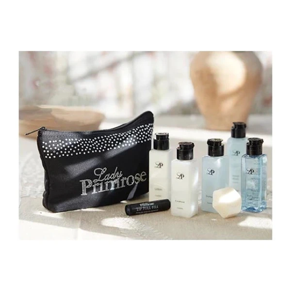 Lady Primrose Momentous Travel Set is a 7-piece travel set includes bath gel, hand wash, lotion, shampoo & conditioner all in the perfect travel size.  Presented in our Lady Primrose sparkle bag.  Travels nicely in any luggage or handbag.  Makes a great gift and party favor!  Hostess gifts, birthdays, or showers!  Refillable!  Meets TSA requirements!   Added bonus:  Lip Fulfill and our iconic Lady Primrose scented white cream soap.