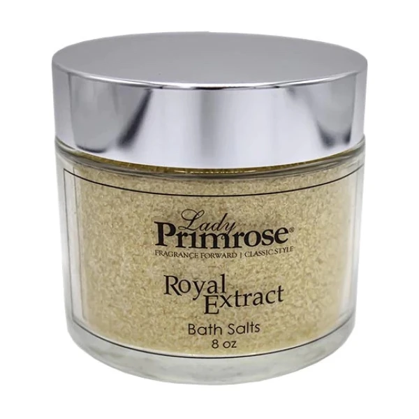 Lady Primrose Royal Extract Bath Salts in jar for your bath! Be swept away with Royal Extract. Simply put in your bath and enjoy.