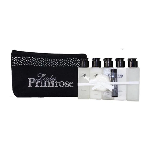 Lady Primrose Tryst Travel Set is a 7-piece travel set includes bath gel, hand wash, lotion, shampoo & conditioner all in the perfect travel size. Presented in our Lady Primrose sparkle bag. Travels nicely in any luggage or handbag. Makes a great gift and party favor! Hostess gifts, birthdays, or showers! Refillable! Meets TSA requirements!