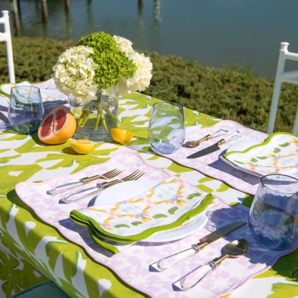 Laura Park Designs' Dogwood Scalloped Dinner Napkins are charming. Classic elegance meets playful pattern. Impress your guests with our scalloped cloth napkins, designed to make a statement. Napkins this lavish can even make your messes look good.  Packaged as a set. 4 napkins included in each set. 100% Cotton.