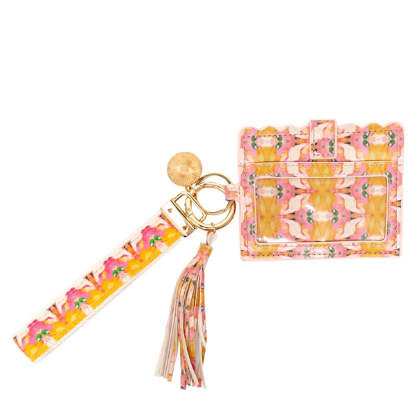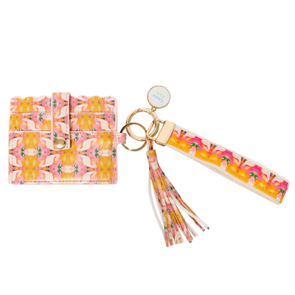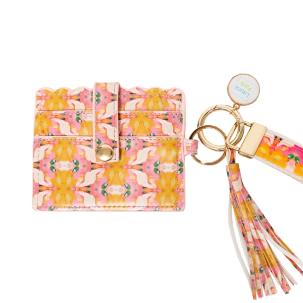 Laura Park Designs' Flower Child in marigold wristlet is going to make going out on the town less cumbersome.  Cotton wristlet strap makes it comfortable to tote around or easily fits in your purse.  Wristlet  includes wallet, tassel, and wristlet strap.  Detachable metal ring. Faux leather.
