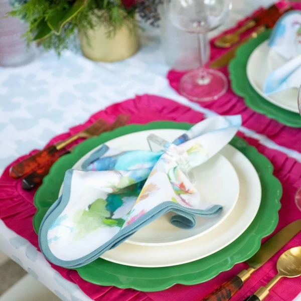 Laura Park Designs' Park Avenue Scalloped Dinner Napkins are charming. Classic elegance meets playful pattern. Impress your guests with our scalloped cloth napkins, designed to make a statement. Napkins this lavish can even make your messes look good.  Packaged as a set. 4 napkins included in each set. 100% Cotton.