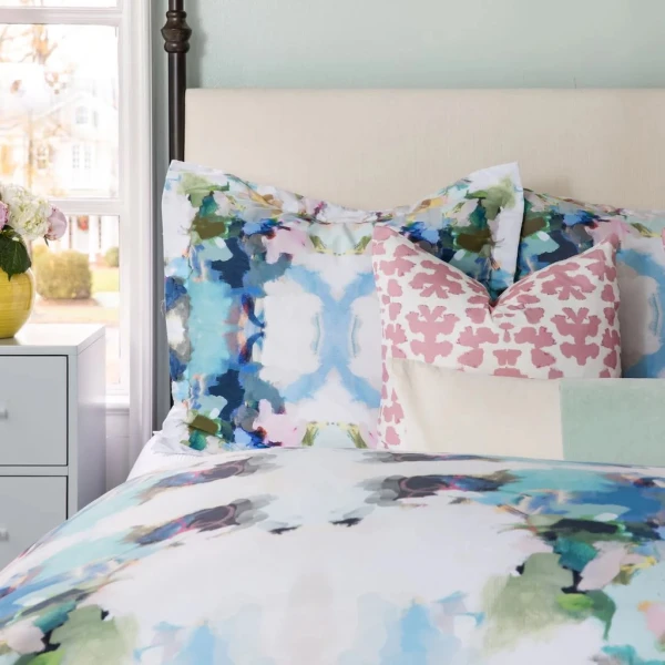 Laura Park's Park Avenue Bedding Collection is gorgeous. The colors are magical and bold on a white background. The pattern is reminiscent of the kaleidoscope and evokes memories of happy childhoods. Duvet Cover is double sided print with button closure. Shams are single-sided print with envelope closure. 100% microfiber.