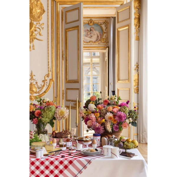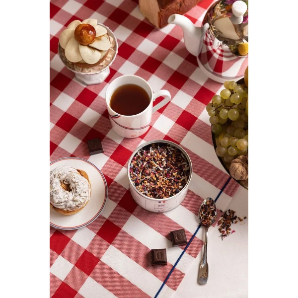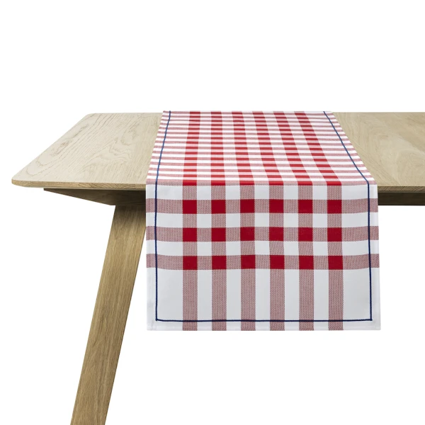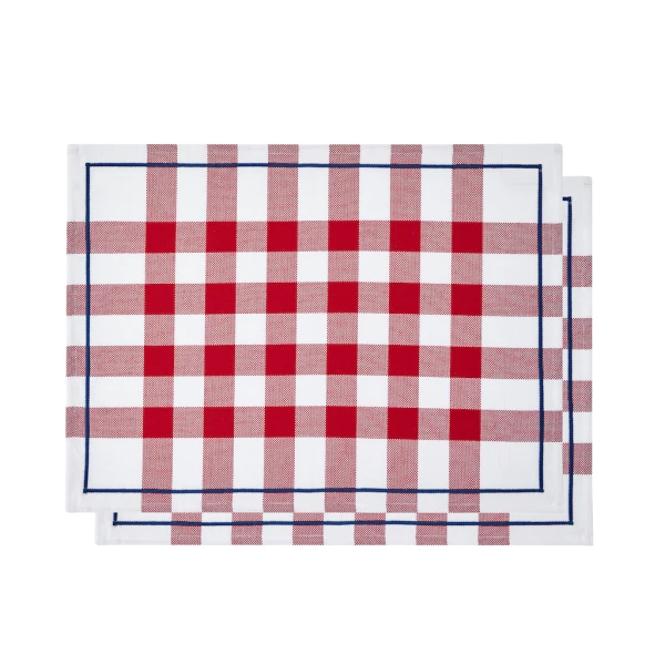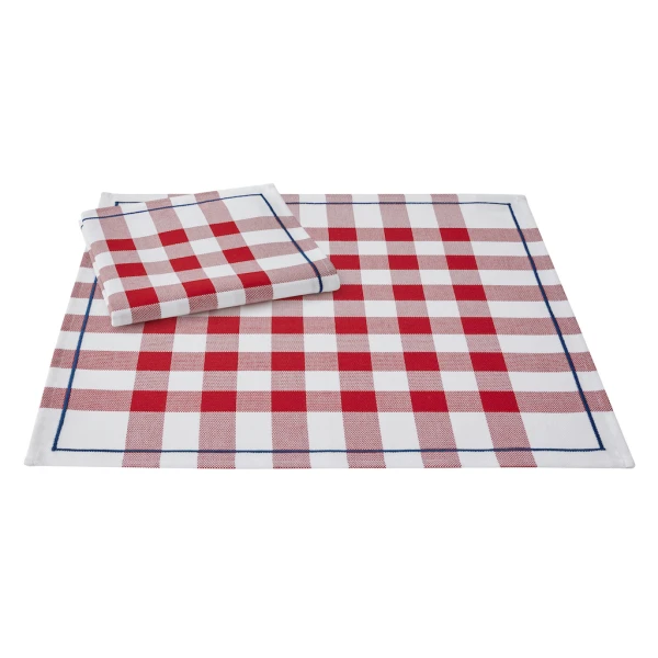 Le Jacquard Francais Bistrot Francais is so French.  A red and white plaid with a blue border that is sweet and traditional. Colored warp and weft. 100% cotton. Combed yarns, long fibers. France.
