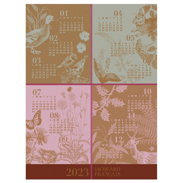 Le Jacquard Francais' Calendrier 2023 Quatre Saisons tea towels have a simple hem and a hanging loop.  This year's calendar tea towel depicts the four seasons with the help of nature.  Each season has its designated quadrant and boast its natural seasonal charm.  100% cotton.  Add to your collection.