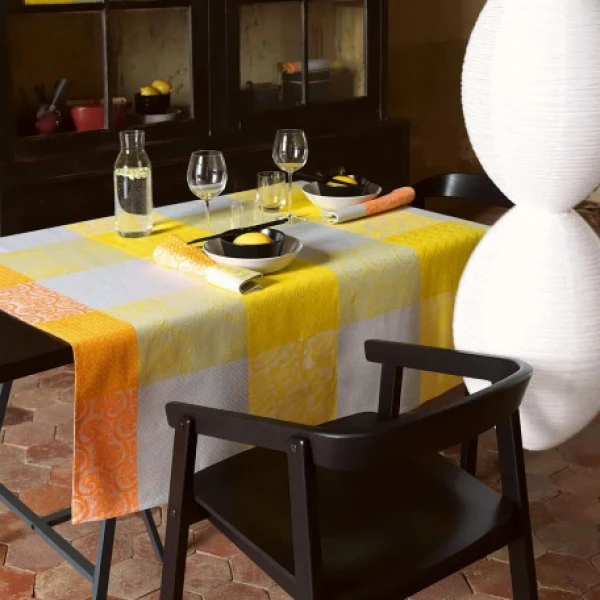 When Spring comes to coated fabric! Japanese influences have reinspired designers' imaginations this year. We find a mix and match of floral signatures and traditional kimono and Japanese paper motifs, revisited in a graphic square style. Available in three color ways.  Napkin not coated. Also available in a coated apron!