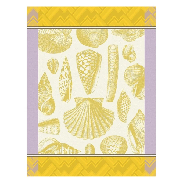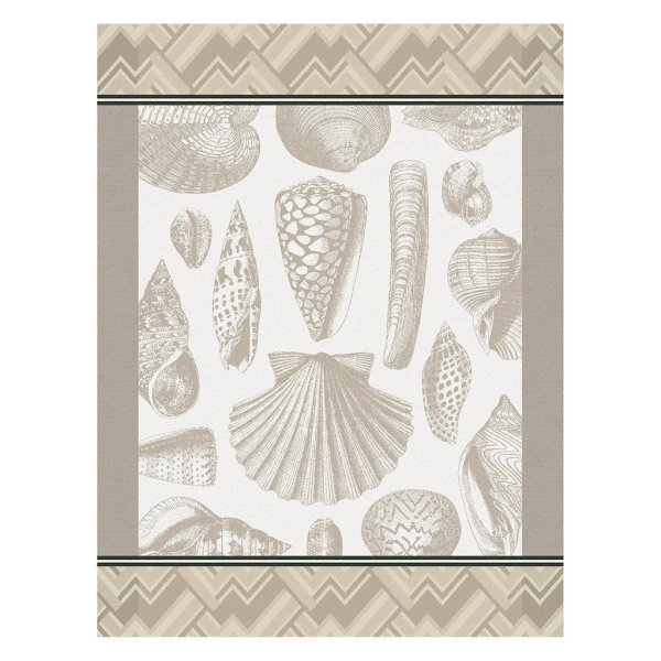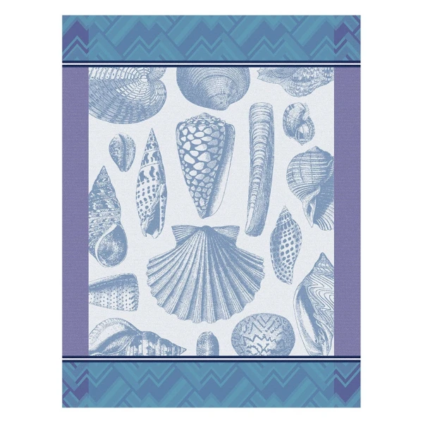 Le Jacquard Francais' Coquillage tea towel is full of wonder.    The design consists of beautiful sea shells. The border is a modern take on the classic chevron pattern.