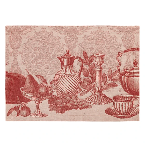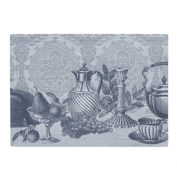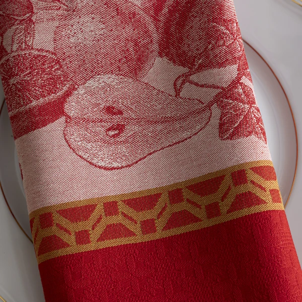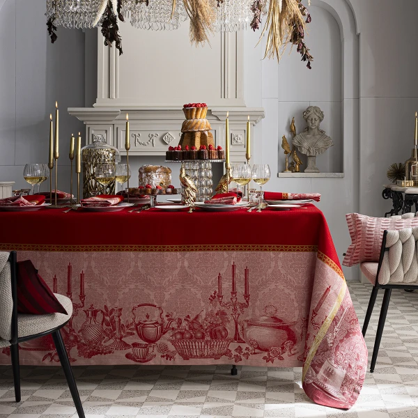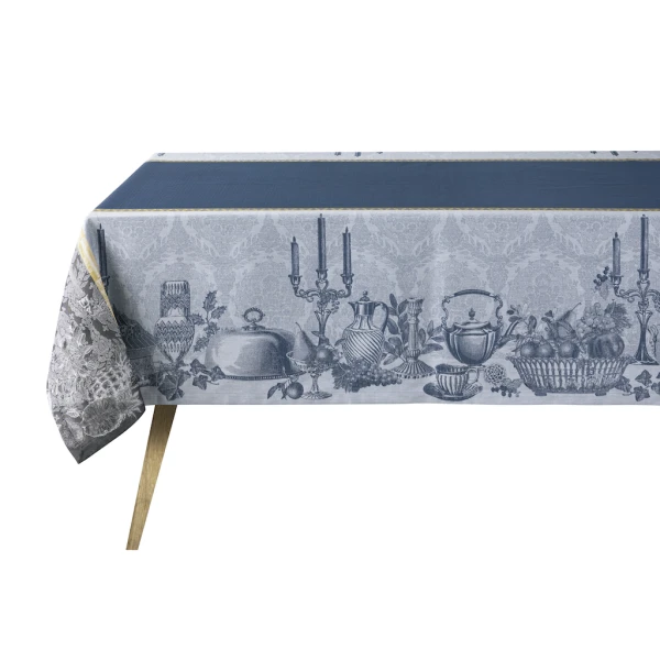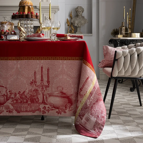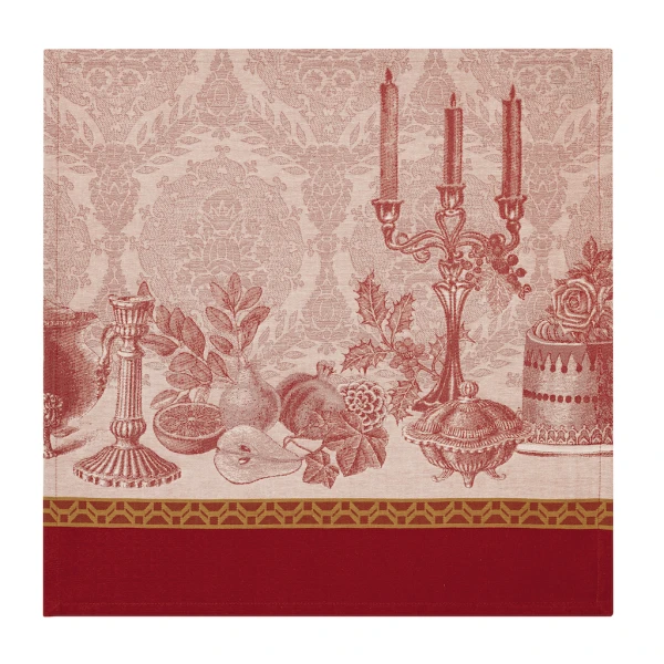 Le Jacquard Francais' Festin table linen collection is gorgeous with an elegant celebratory banquet. The design has beautiful heirloom silver pieces, fruits, holly and a fantastic cake. Festin is available in two colors. 100% cotton. Made in France.