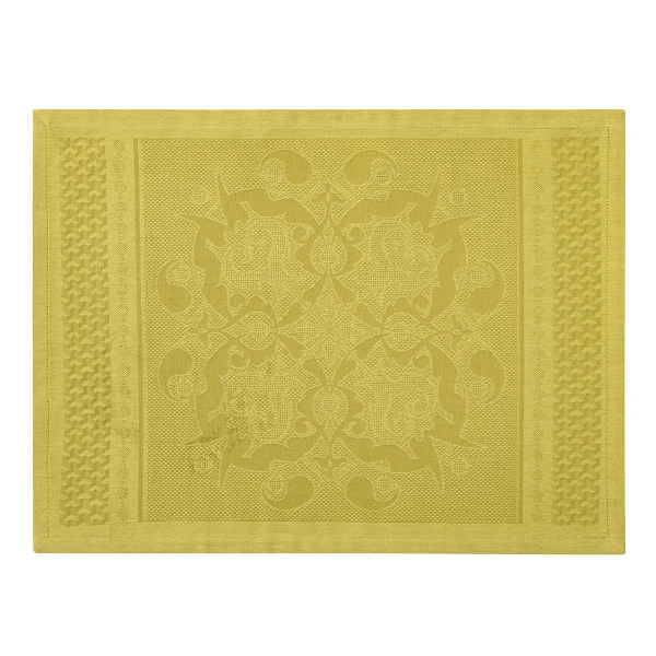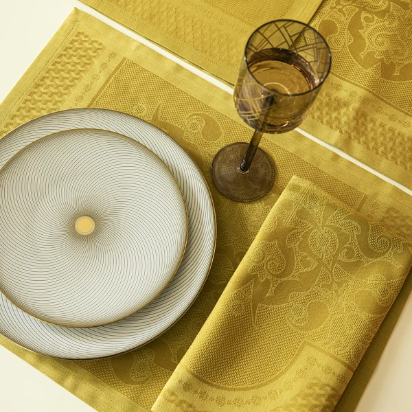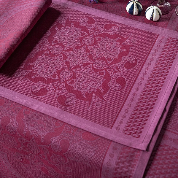 Le Jacquard Francais' Palais Venitien table linen collection is stately. The design has a magnificent and ornate pattern. Palais Venitien is available in three bright jewel tones. 100% cotton. Made in France.