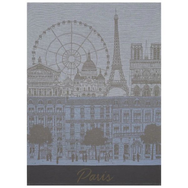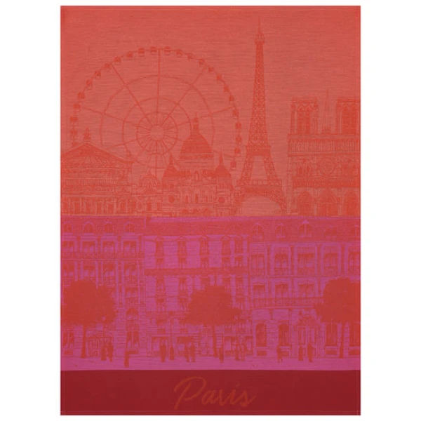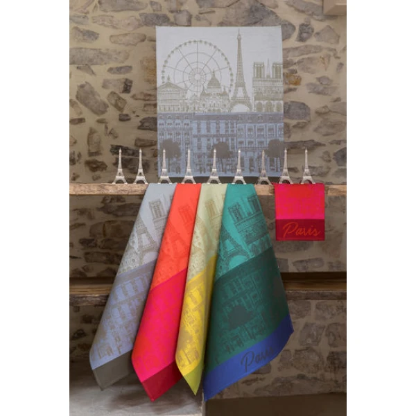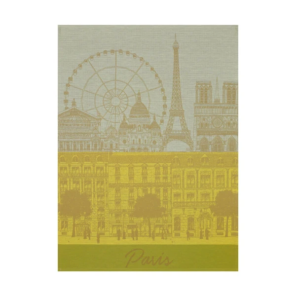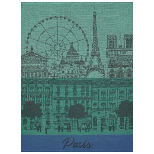 Paris Panorama depicts a typical residential street in pairs on the lower half and famous icons in Paris on the top half. In four colors -- red kiss, azure (blue grey) Garden (green teal). Sun (yellow) 100% combed cotton.