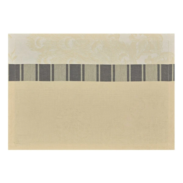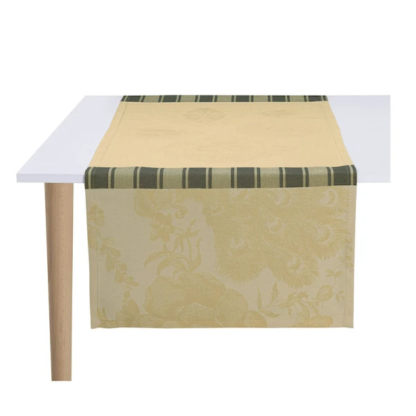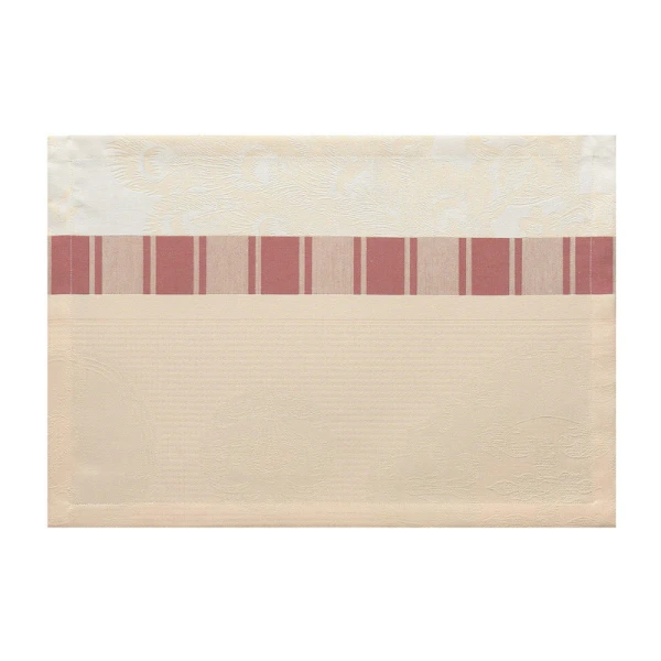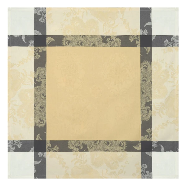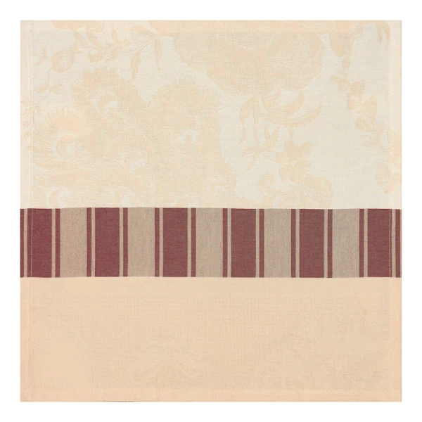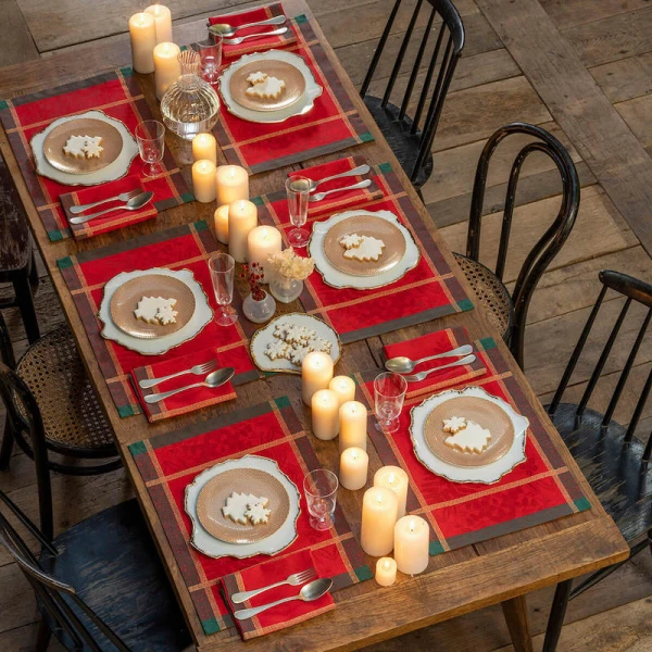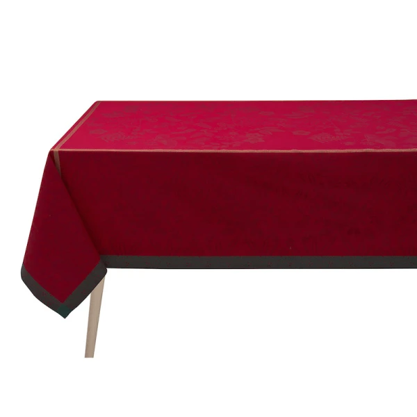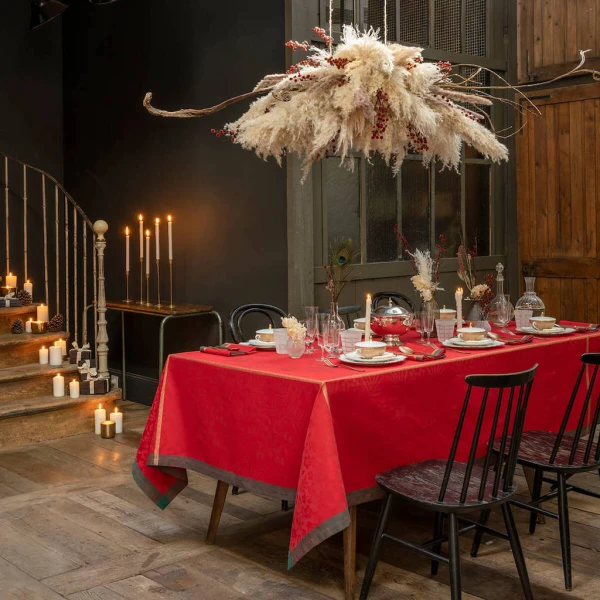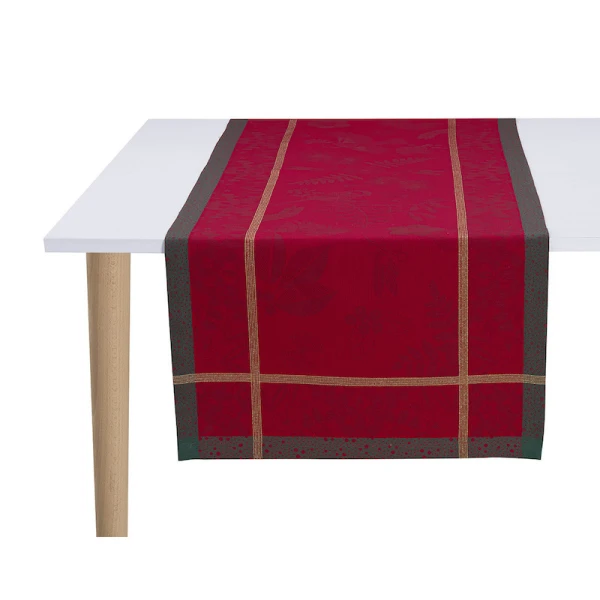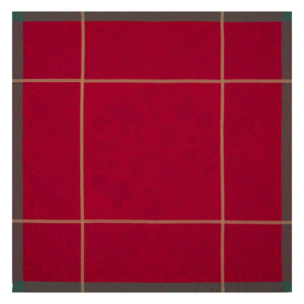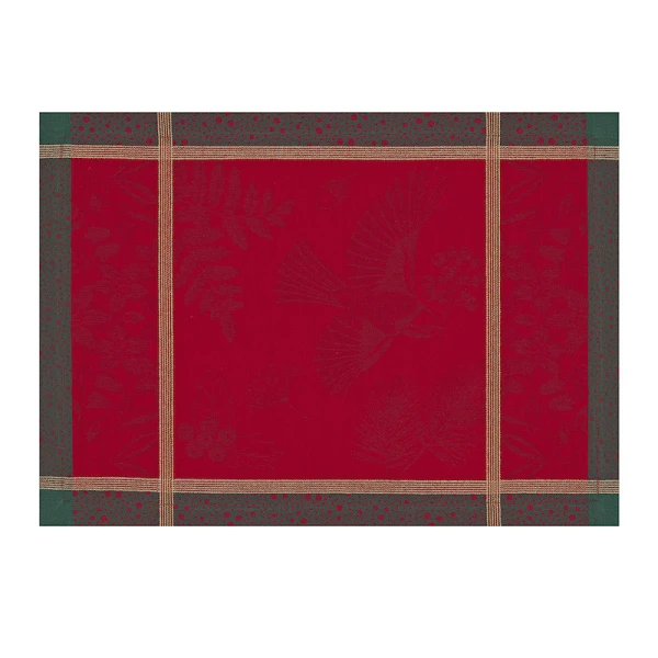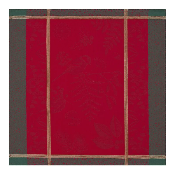 Le Jacquard Francais' Poesie d'Hiver is the 2022 Holiday Table Linen Collection. For a traditional Christmas in a red and green, the winter poetry napkins bring a warm and wintry harmony to your table. Ferns, mistletoe branches, chickadees, foliage, pine cones, hellebores, holly form an elegant round, surrounded by a Victorian style floral pattern. A charming collection in the heart of winter to illustrate a still preserved nature.  Made in France.