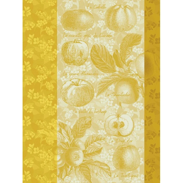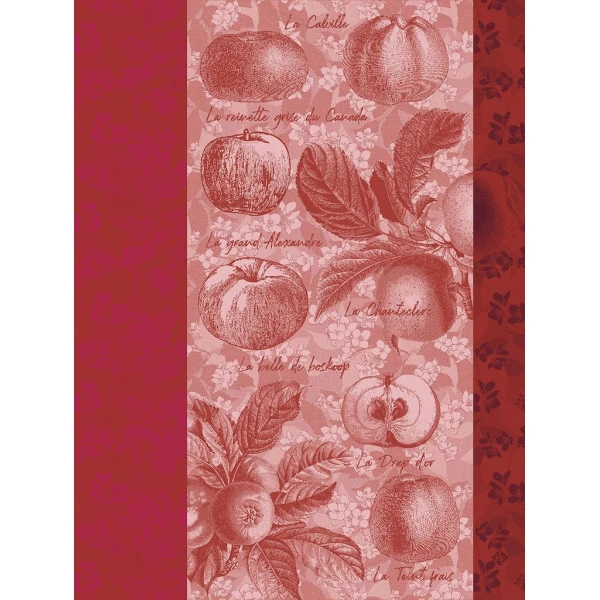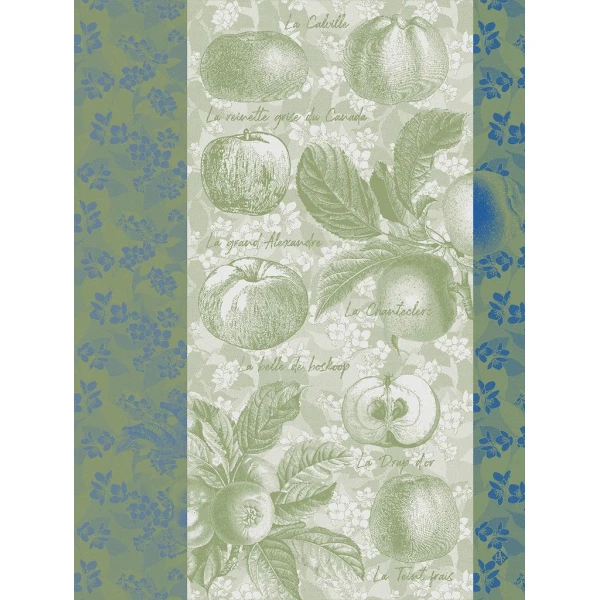 Le Jacquard Francais' Pommes a Croquez tea towel is gorgeous.  The towel showcases the sweet or tart Apples of France.  The background is of delicate blossoms and the border is its contrast.