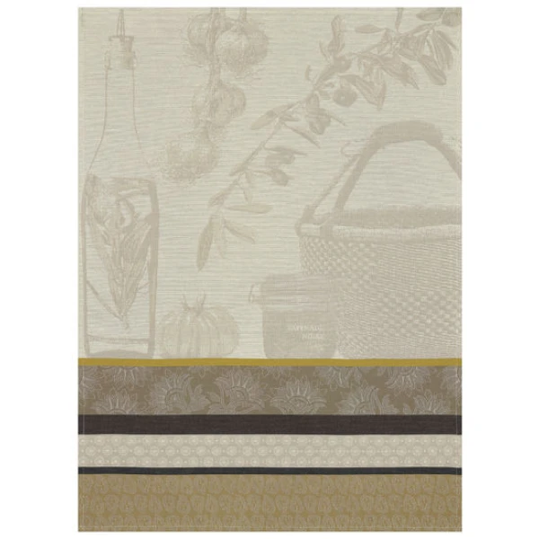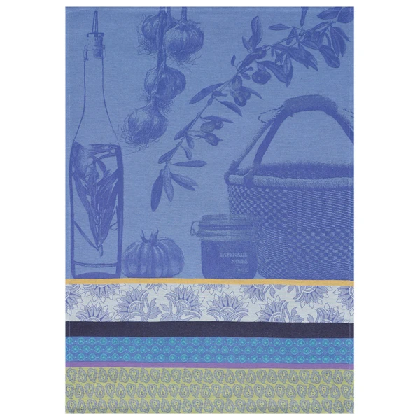 From Le Jacquard Francais, the Saveurs de Provence tea towel comes in three color combinations. A woven basket, a jar of jam, a bottle of herbed vinegar all decorate this towel.  Coordinates with the Terre towel. One of our most popular towels! Traditional LJF -- jacquard woven in 100% cotton.