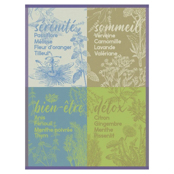 Le Jacquard Francais' Sérénités tea towels are all about your well being and achieving it through nature's bounty.  Reminding you of the little things like good sleep.  Softness and tranquility are the key words of our Sérénité collection!  Le Jacquard Français tea towels are a real charm in your kitchen!  Thanks to their remarkable qualities, which they derive from the quality of their fibers, they will last for years. They have generous dimensions of 24 x 31" and a woven label to hang them easily in your kitchen.  100% long staple combed cotton. France.