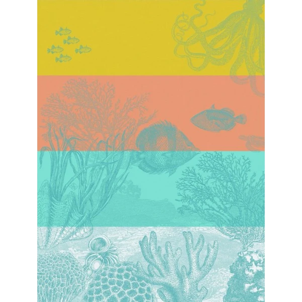 Le Jacquard Francais' Sous L'Ocean tea towel in orange is spectacular with colorful broad stripes and an under the sea theme. Available in three colors. 100% cotton. Size: 24 x 31". Made in France.